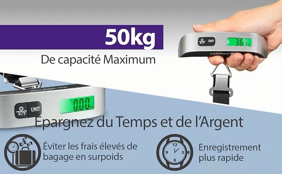 Balance portable parfait pour assurer que votre valise n’est pas surpoids affichage Lcd numérique poids maximum 50kg mise hors tension automatique petit et léger facile à utiliser et à transporter fonction zéro et tard indication batterie surcharge faible système de capteur de jauge de contrainte de haute précision